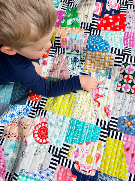 Have fun using up all your novelty fabrics to make this fun, machine pieced project. Suitable for beginners, this quilt makes the perfect "I Spy" quilt for children.
