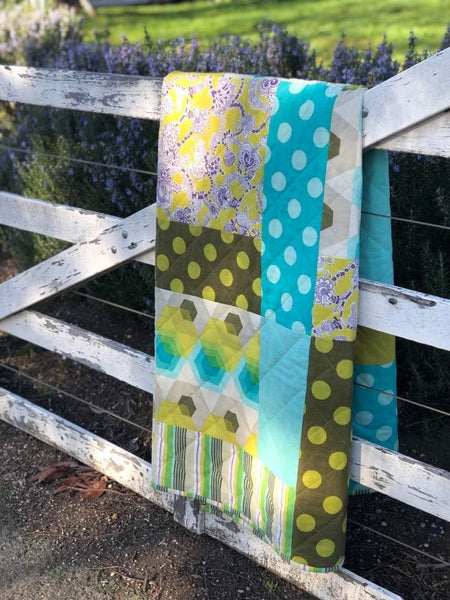An excellent quick quilt to make for a present for a loved one. Looks great over the back of a couch and is perfect for showcasing those larger print fabrics.
