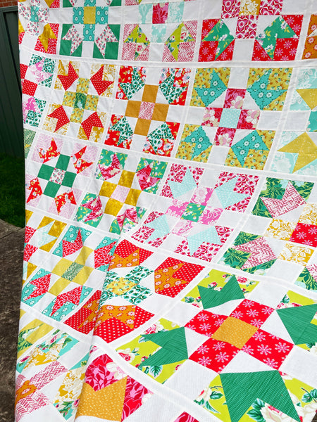 A fat quarter friendly quilt that features quick piecing for making half square triangles. The design is also suitable for fussy cutting fabrics or for showcasing a complete range. The pattern also includes a colouring sheet to make choosing your fabrics so much easier.