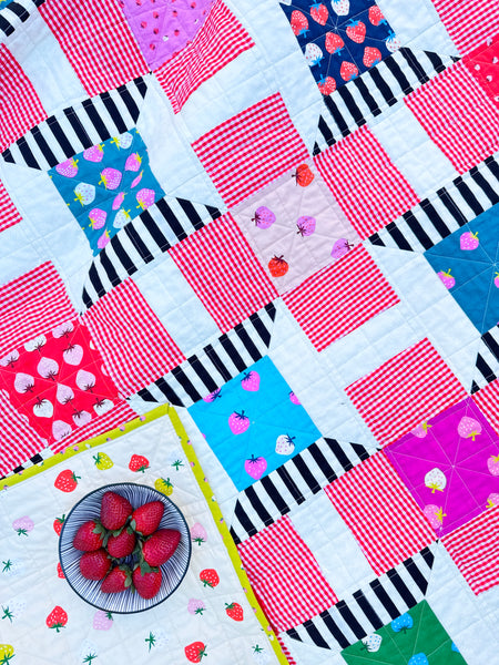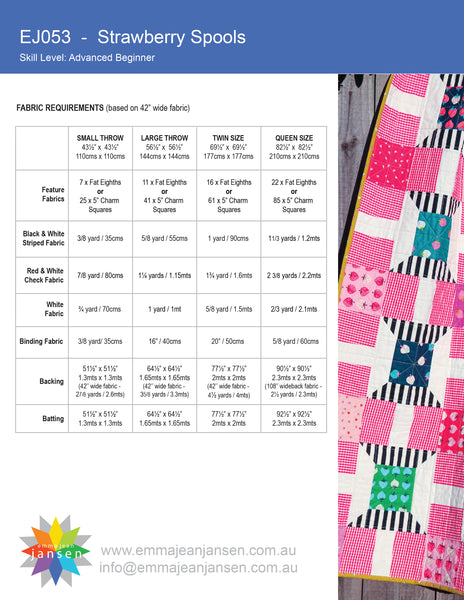 The Strawberry Spools quilt pattern is designed especially for 5” charm squares and includes full instructions for four sizes: small throw, large throw, twin, and queen. Suitable for advanced beginners, the pattern is quick, fun, and satisfying to piece together. With its clear directions and adaptable sizing, it’s the perfect project for using your favourite charm packs to create a beautiful quilt for any occasion.