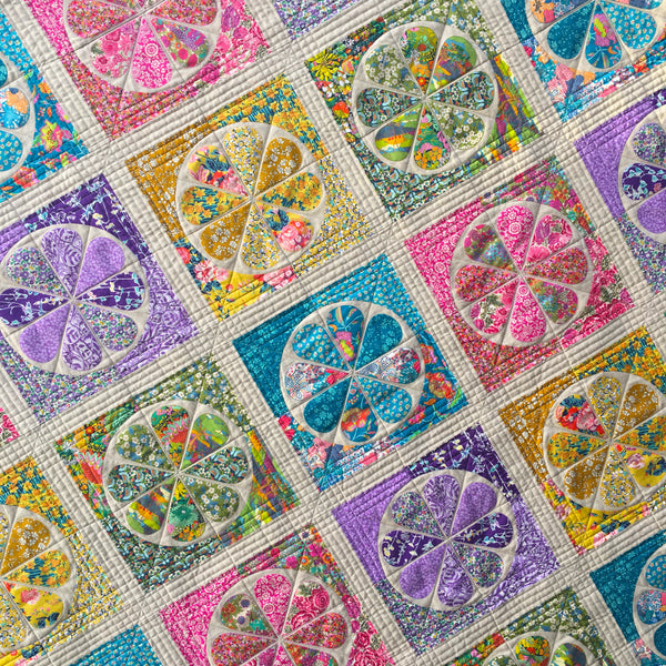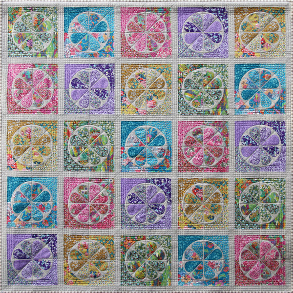 This quilt is a great way to show off pretty fabric collections and features Raw Edge Appliqué and curved piecing with the Drunkard’s Path block. The quilt can be made using Fat Quarters and a colouring sheet is included.
