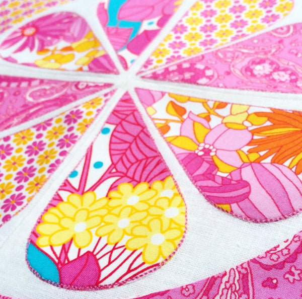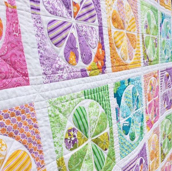 This quilt is a great way to show off pretty fabric collections and features Raw Edge Appliqué and curved piecing with the Drunkard’s Path block. The quilt can be made using Fat Quarters and a colouring sheet is included.