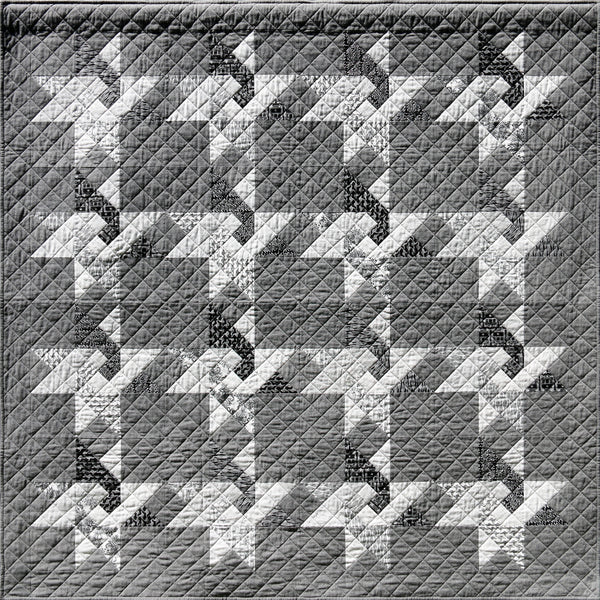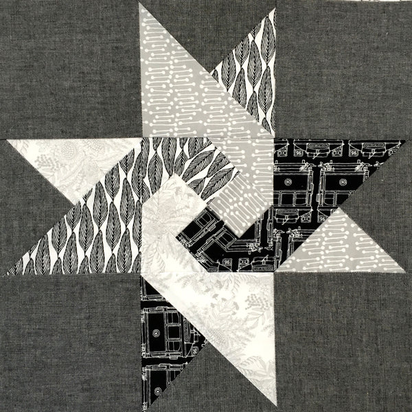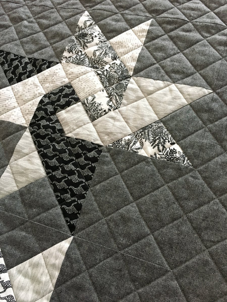 The clever piecing in this quilt creates a design that has lots of movement and style. Made using Emma's new range of fabrics, Classics and teamed with a charcoal grey which makes the black and white fabrics pop! Step by step diagrams and easy to follow instructions are included in this pattern. A colouring sheet is included too!